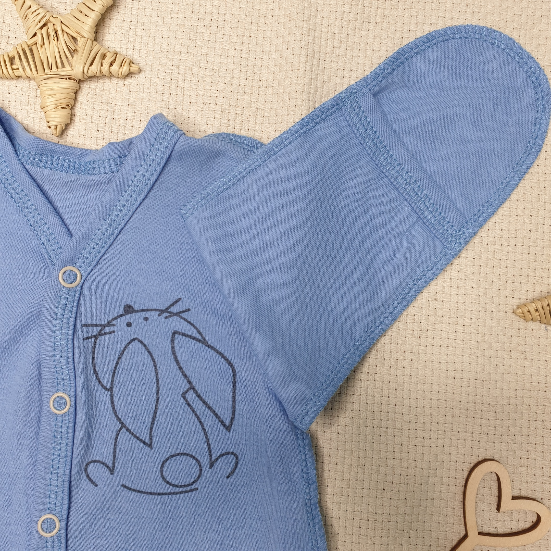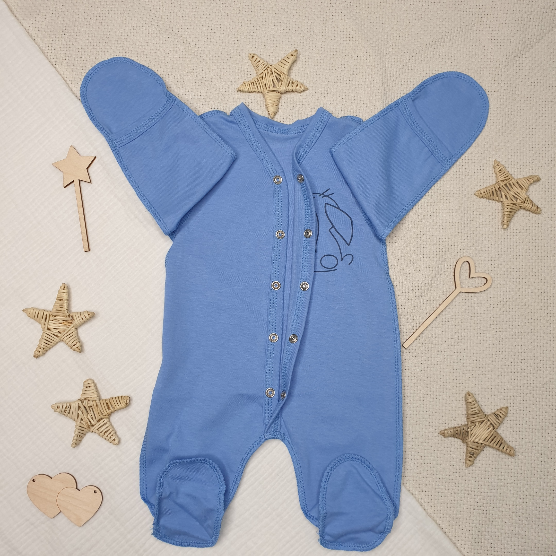 Комбинезон выполнен в мягких пастельных тонах, снабжен ручками-антицарапками и закрытой ножкой, вид застежки - кнопки, очень удобен для малыша, так как сшит швами наружу.