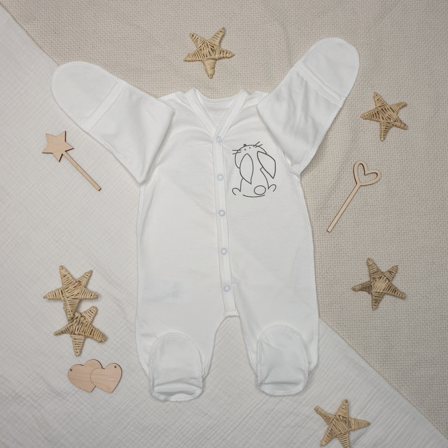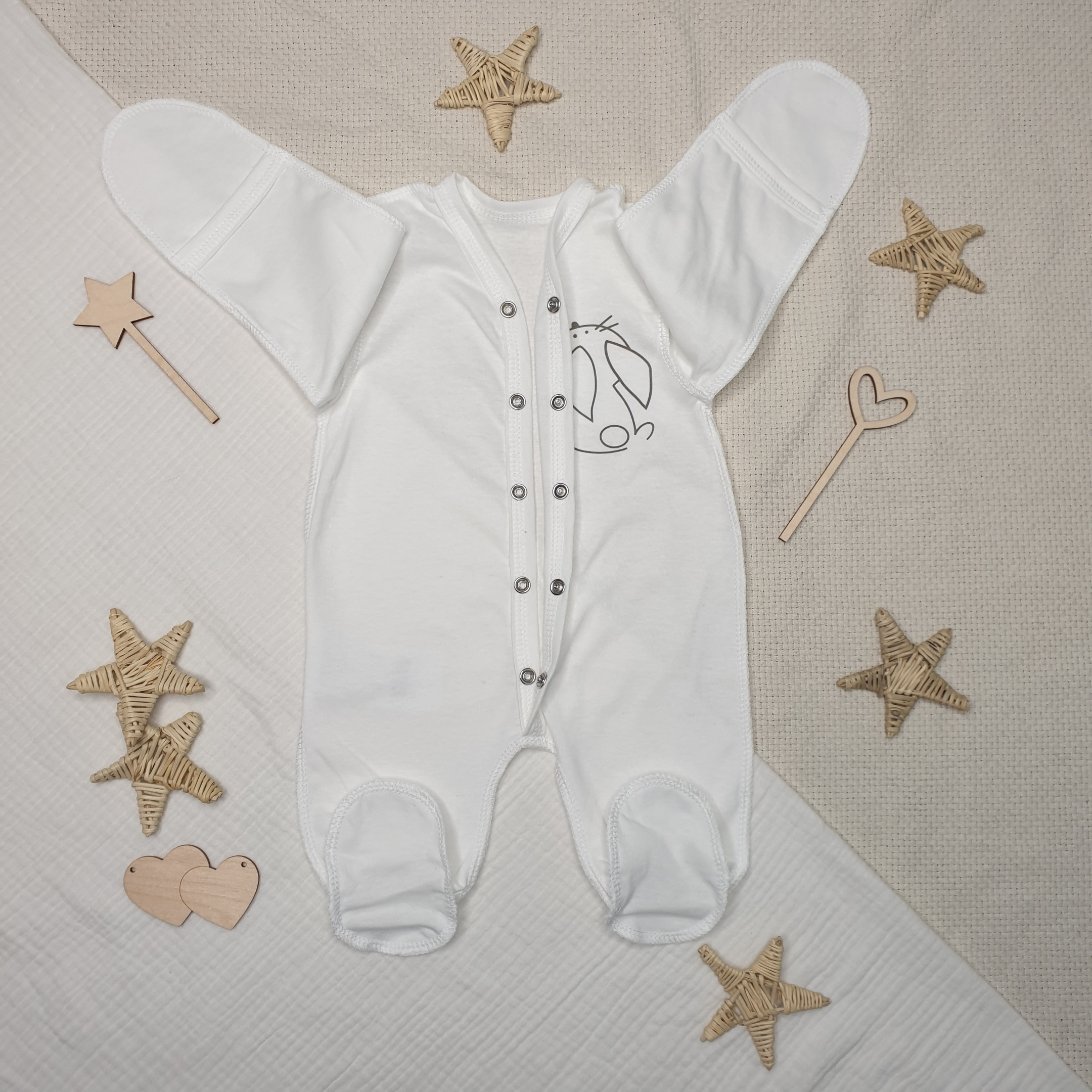 Комбинезон выполнен в мягких пастельных тонах, снабжен ручками-антицарапками и закрытой ножкой, вид застежки - кнопки, очень удобен для малыша, так как сшит швами наружу.
