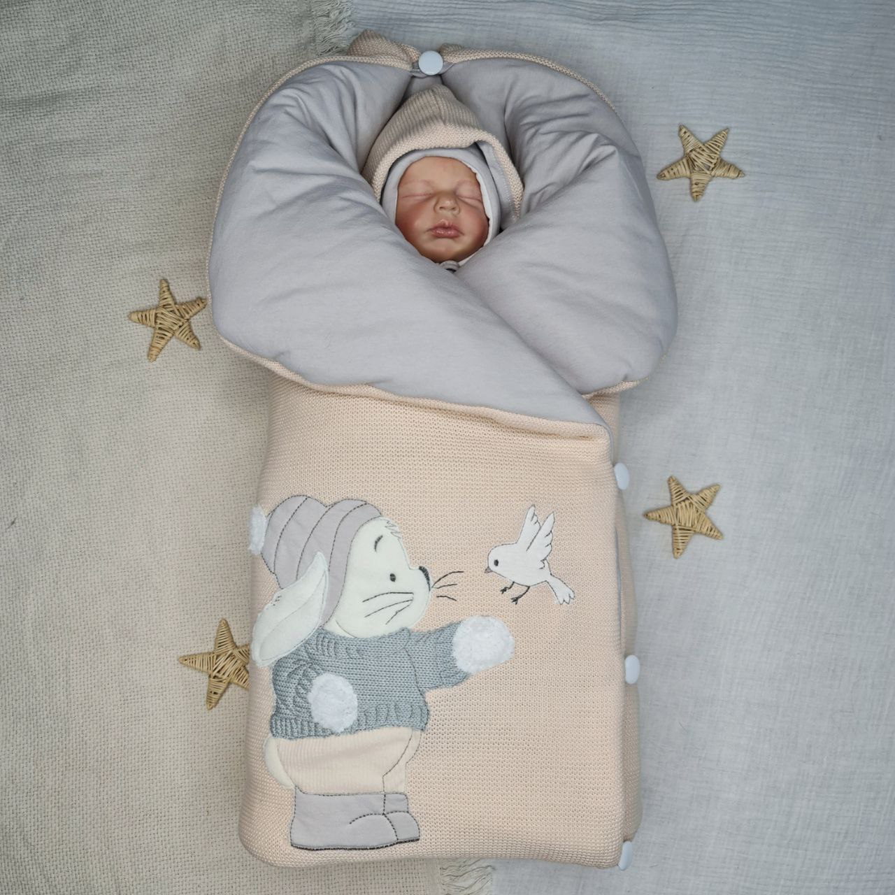 В комплекте одеяло-конверт жемчужная вязка 90*90, на 3 х пуговицах, холстон кулирка серо-бежевая.