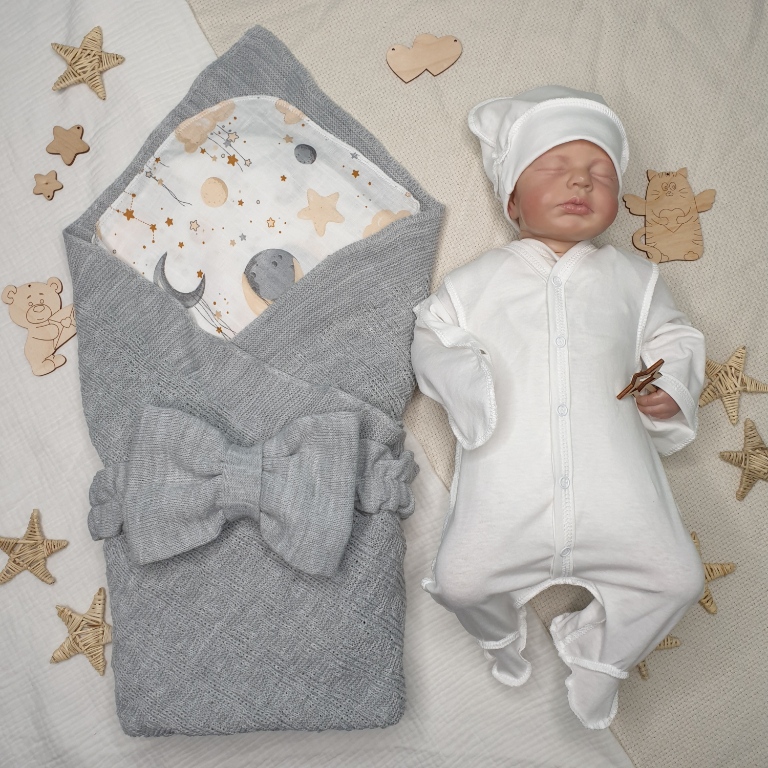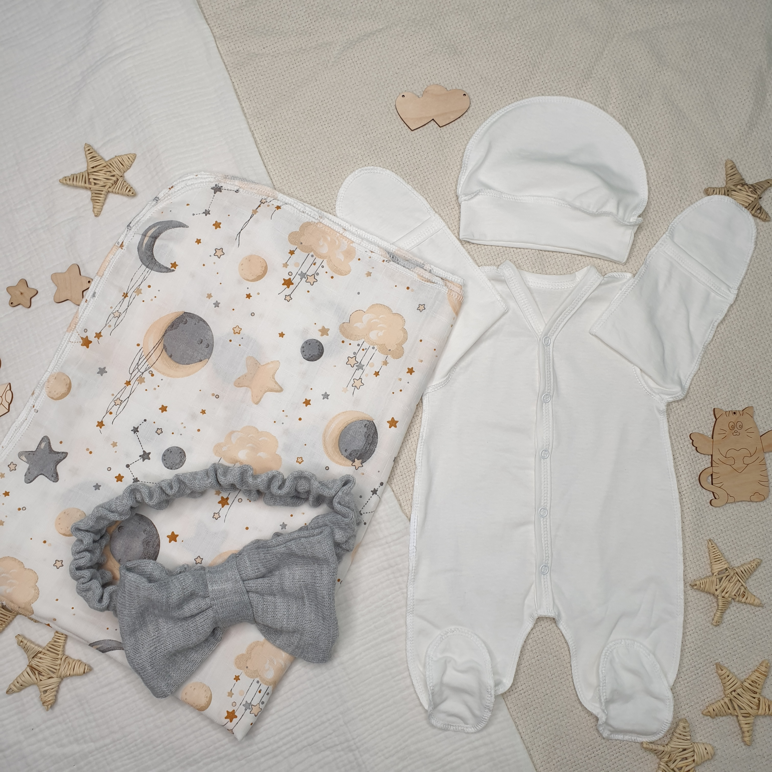 В наборе для новорожденного пеленка из набивного муслина, комбинезон слип из молочного трикотажного хлопка, модель с удобной застежкой на кнопках, рукава трансформер, ножка закрытая, швы наружу.