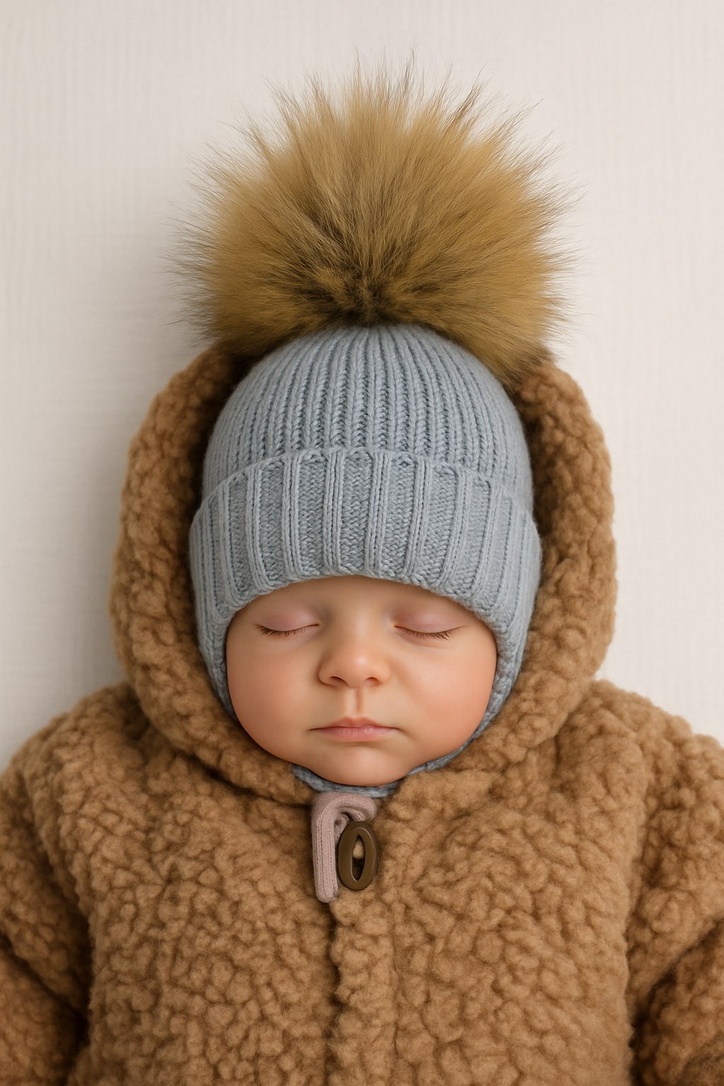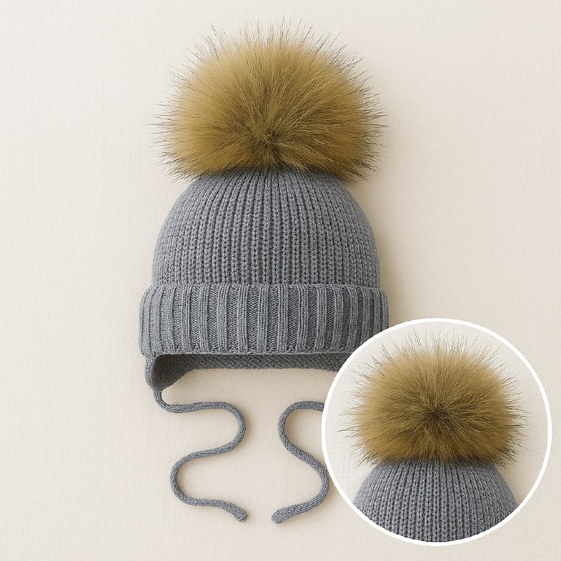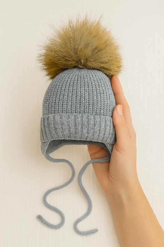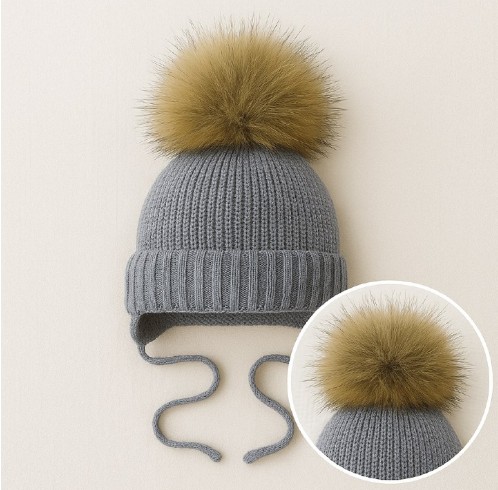 Модель: зимняя детская шапочка на завязках, с объёмным коричневым помпоном.