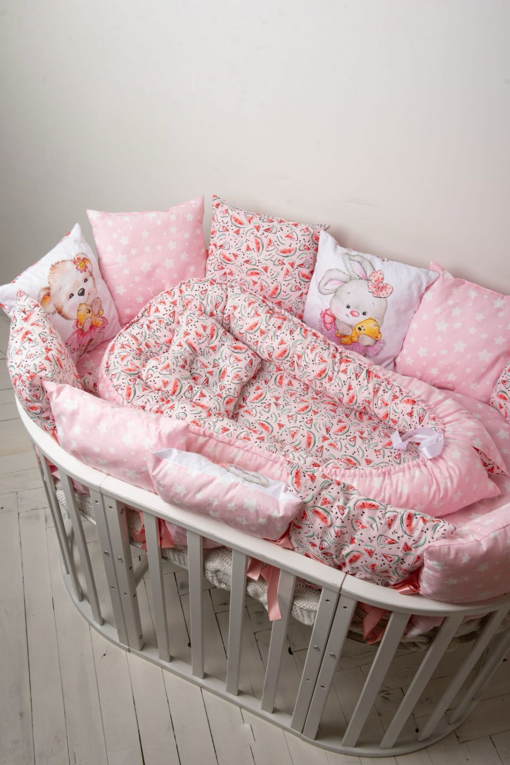 Бортики-подушки 12 шт с принтами на 4 подушках из 100% хлопка - бязь с двух сторон + постельное белье:
