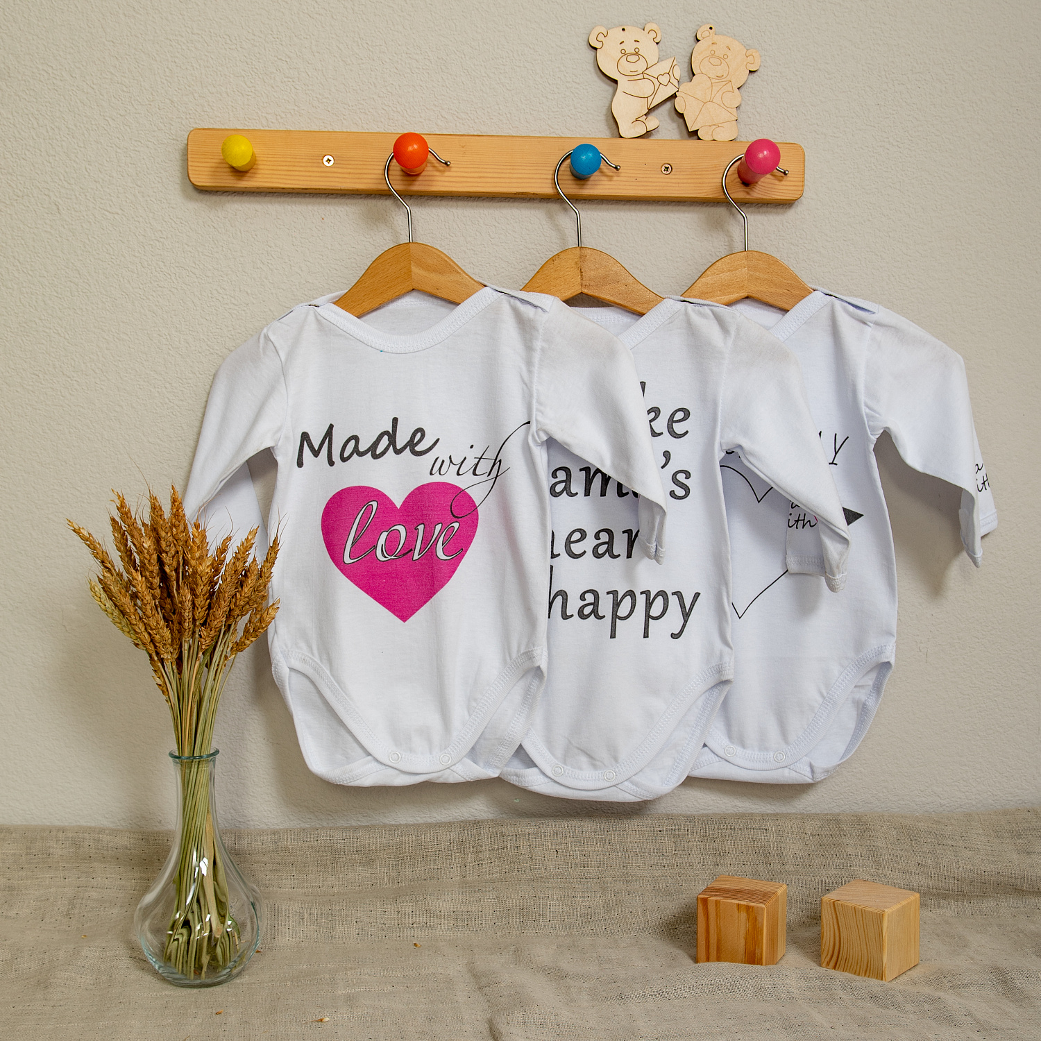Боди с длинными рукавами из гипоаллергенной хлопковой ткани-кулирка, на плече и между ножек надежные кнопки.