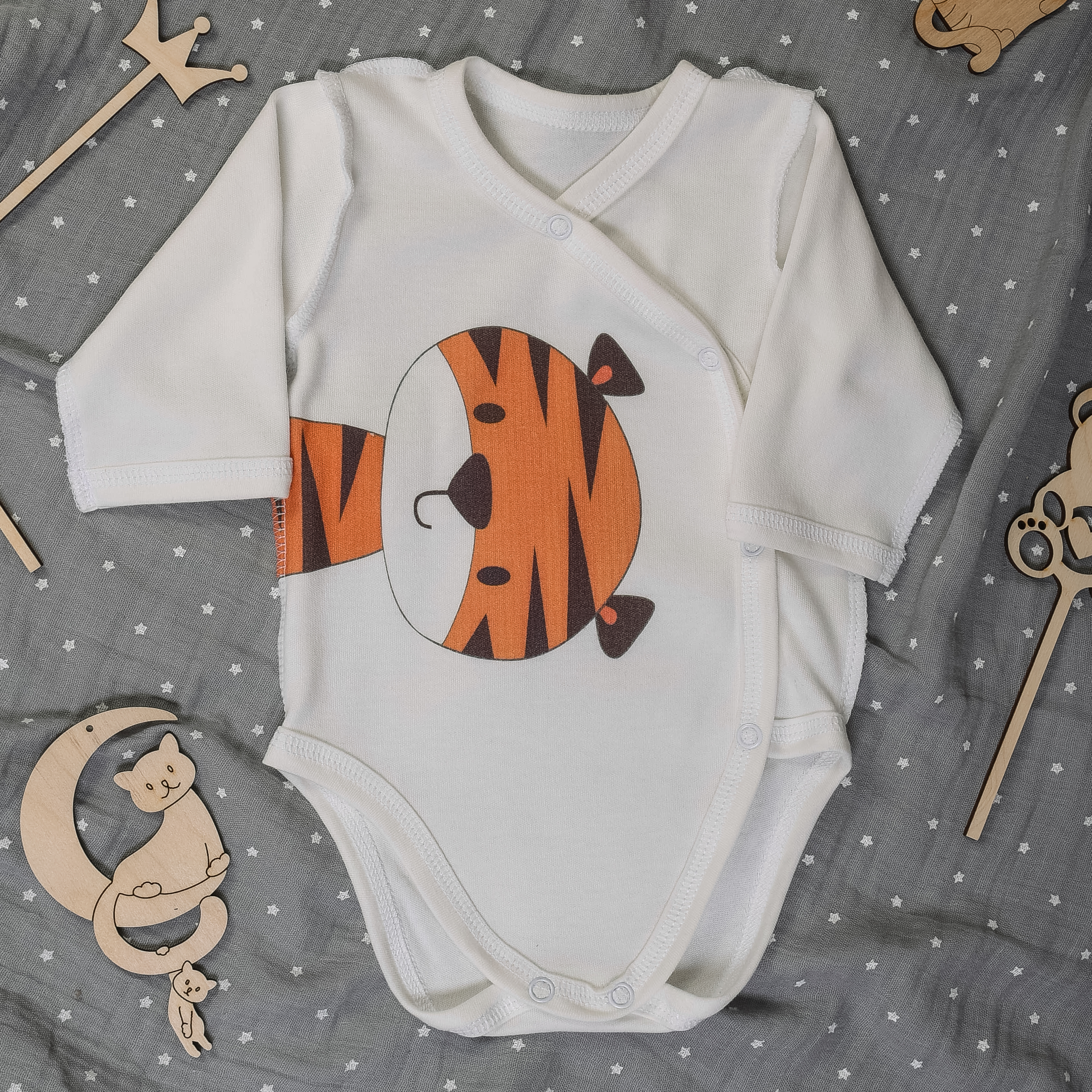 Данная модель боди, мягкая и прочная ткань интерлок, длинный рукав удобная застежка на кнопках, классный интересный принт Тигренок, красиво для дома и идеально для подарка.