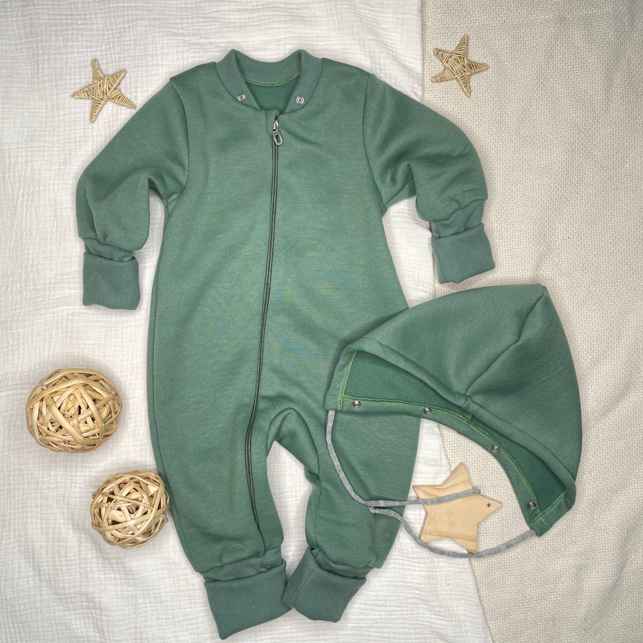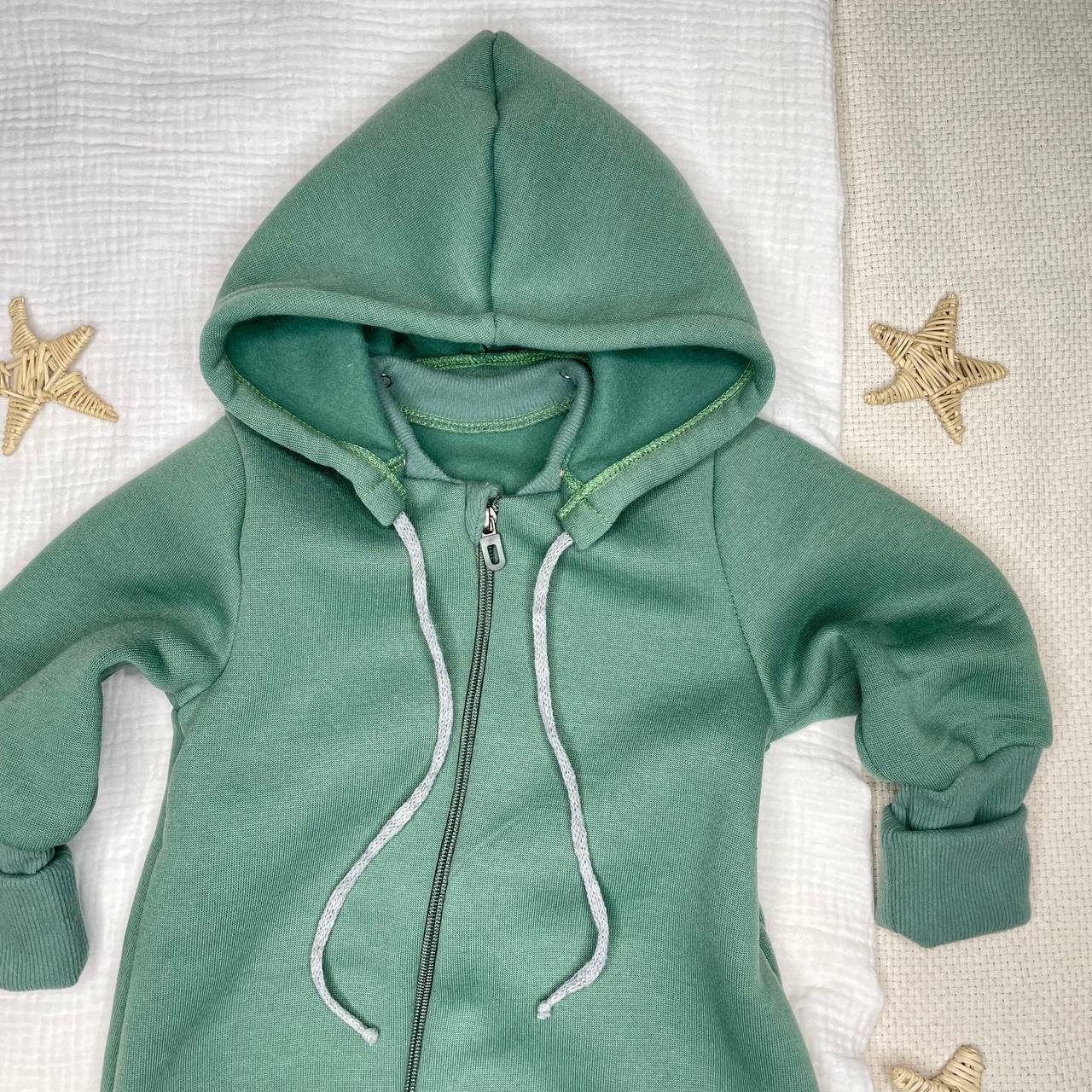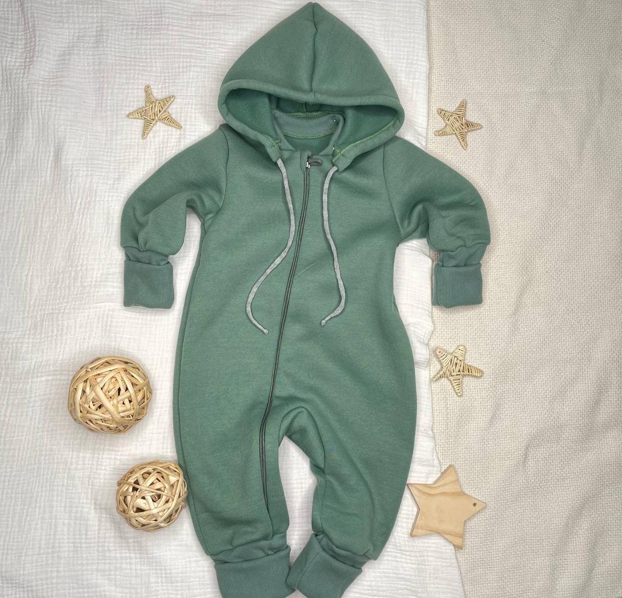 Комбинезон из футера, на молнии, с отстёгивающимся капюшоном. Растущие манжеты. Приятный цвет