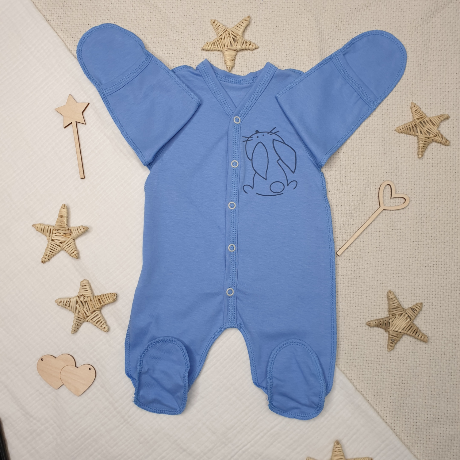 Комбинезон выполнен в мягких пастельных тонах, снабжен ручками-антицарапками и закрытой ножкой, вид застежки - кнопки, очень удобен для малыша, так как сшит швами наружу.