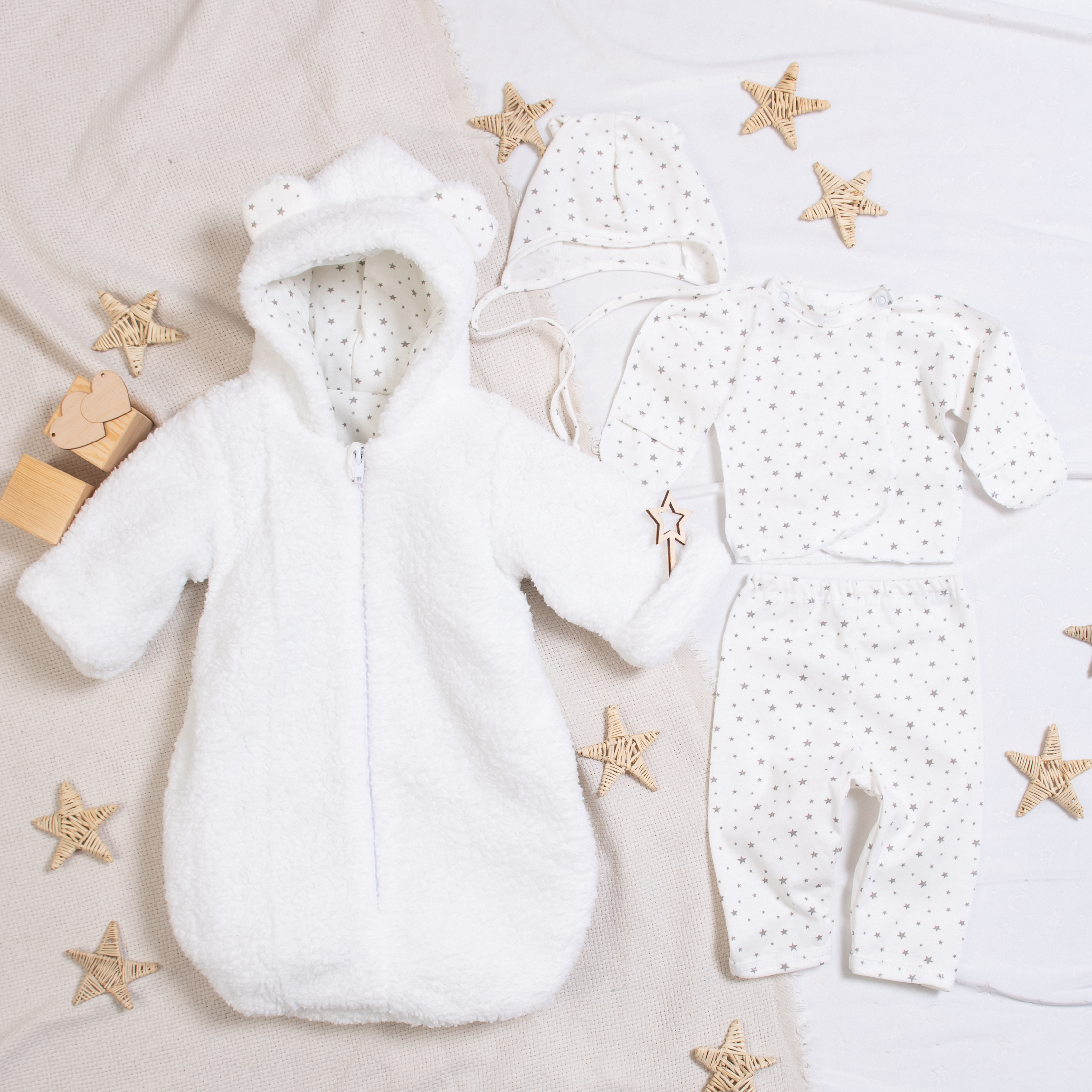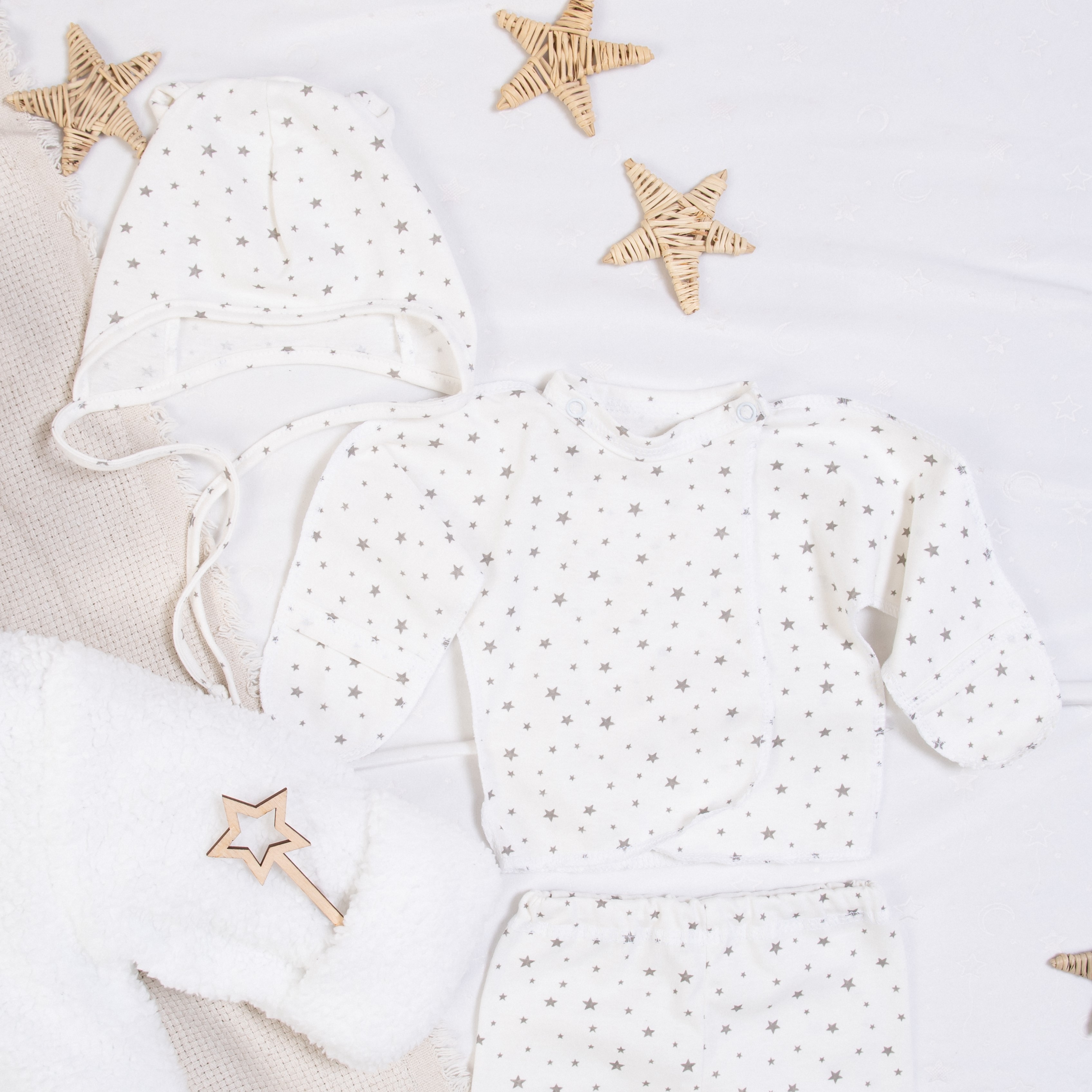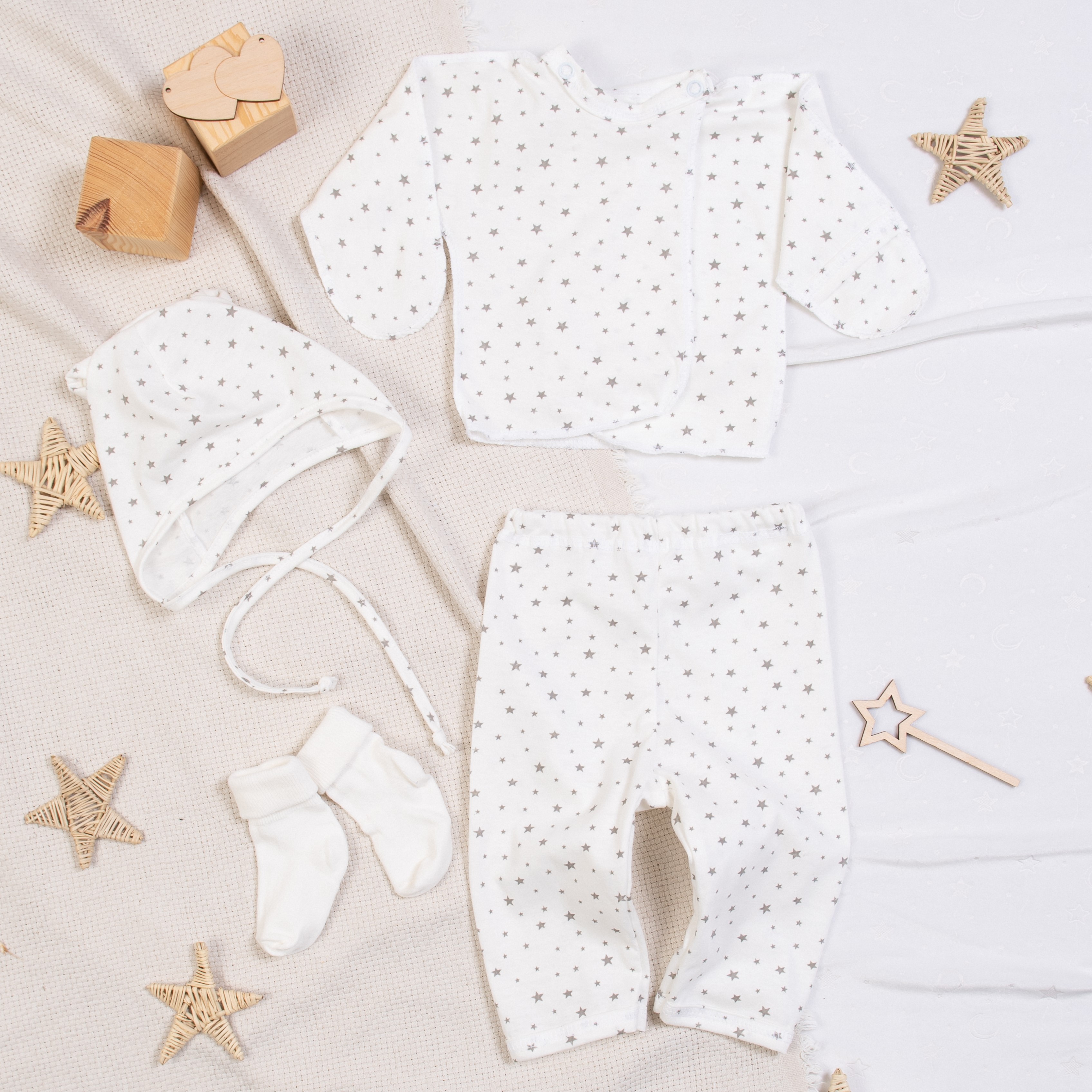 Комплект на выписку включает в себя практичную комплектацию из распашонки на кнопках, штанишек на резинке, белые носочки и чепчик на завязках.