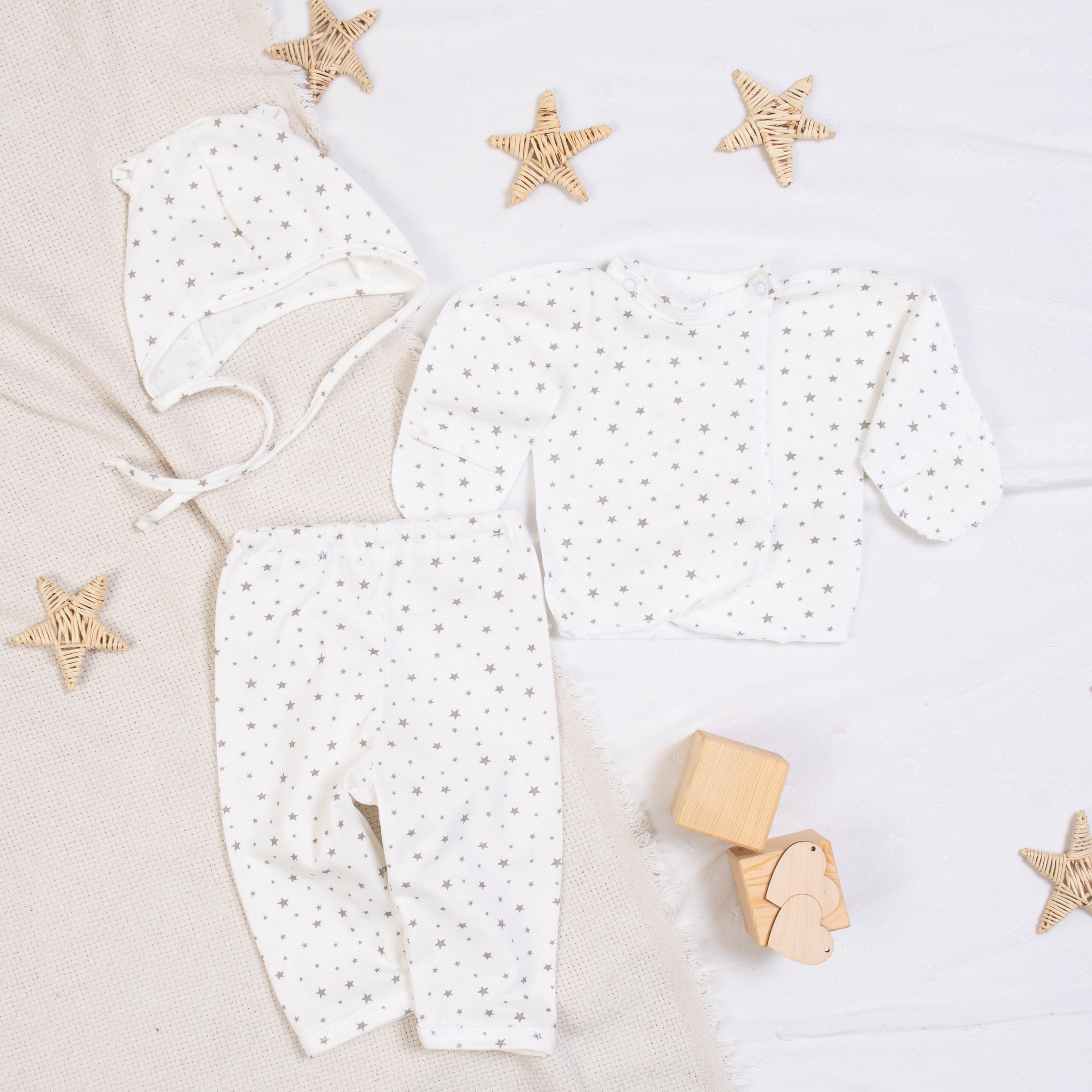 Комплект на выписку включает в себя практичную комплектацию из распашонки на кнопках, штанишек на резинке, белые носочки и чепчик на завязках.