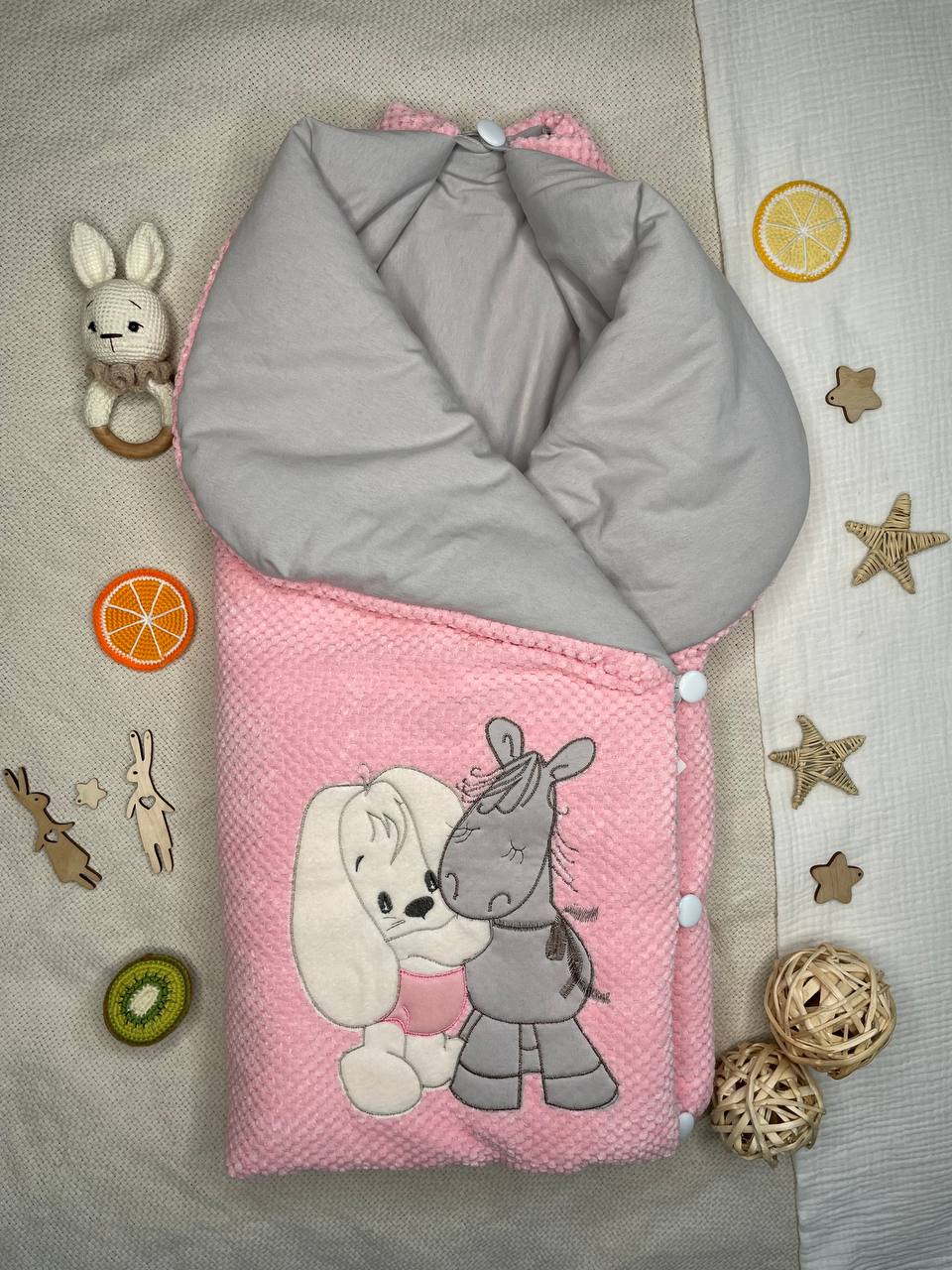 Универсальный конверт из вельвета со сложным рубчиком трансформируется в удобное одеяло, которое можно использовать до достижения ребенком 2-3 лет. В него можно быстро укутать новорожденного, застегнув одной рукой две пуговки. При помощи третьей пуговицы формируется уголок. Уголок-капюшон прекрасно защитит малыша от непогоды. Конверт приятной ворсистой текстуры, формоустойчив, обладает хорошей воздухопроницаемостью и гигроскопичностью, утеплён холстоном, подклад из натурального хлопка кулирка. Размер конверта-одеяла в развёрнутом виде 90х90 см. Модель украшена комбинированной вышивкой с аппликацией.