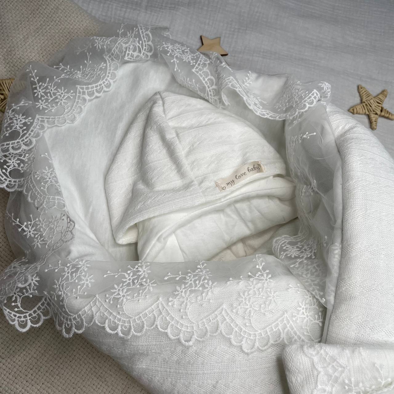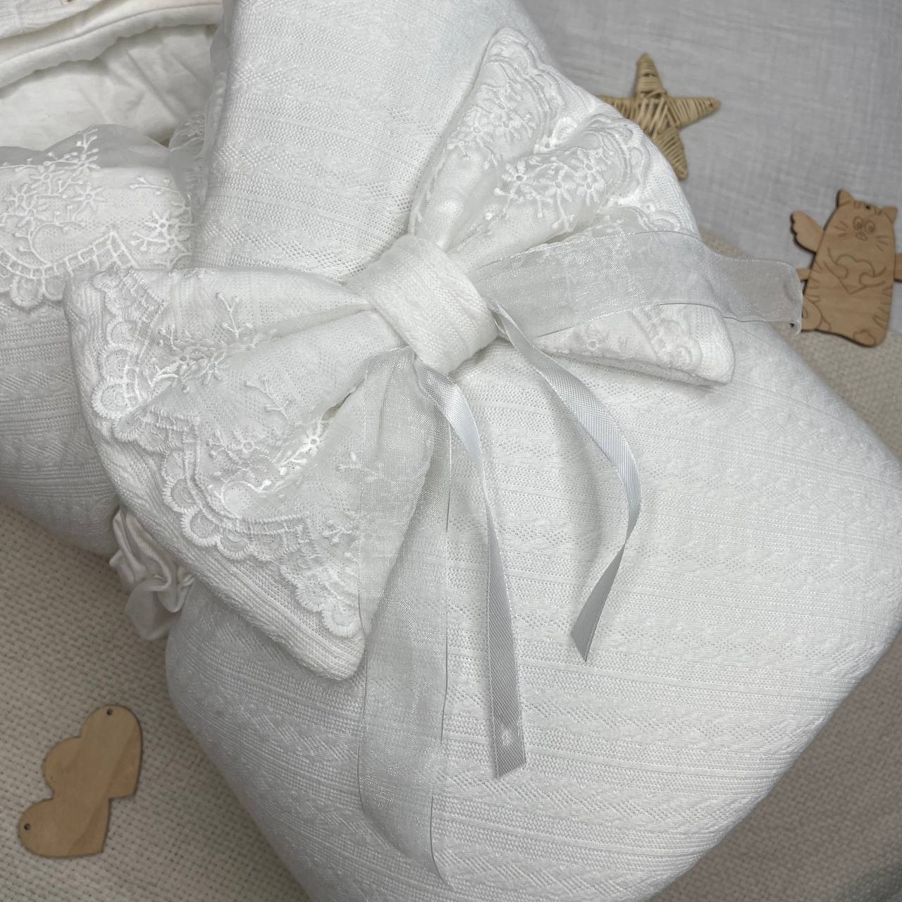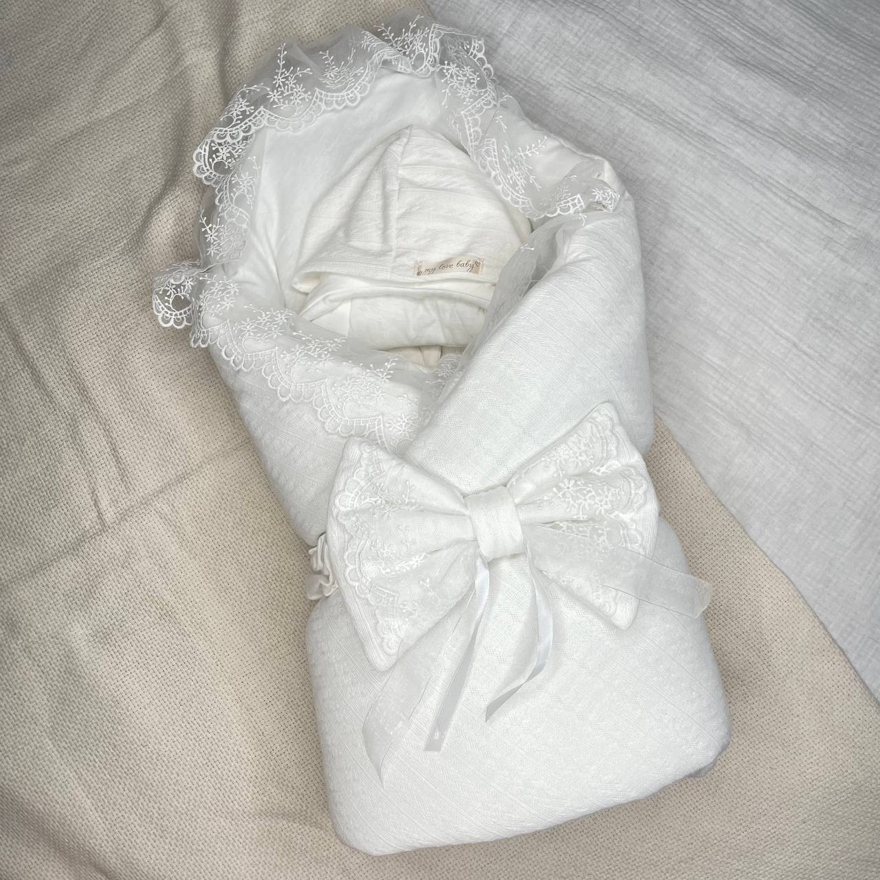 Белоснежный комплект на выписку с кружевом и шикарным бантом