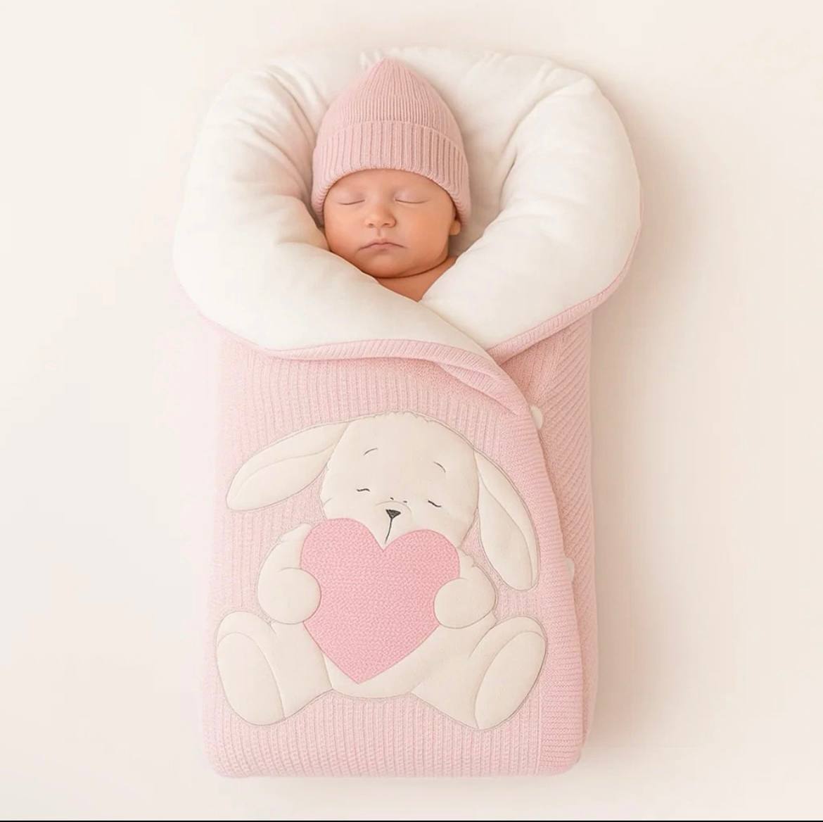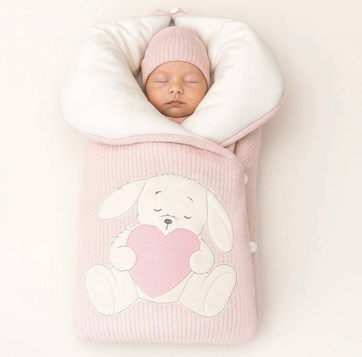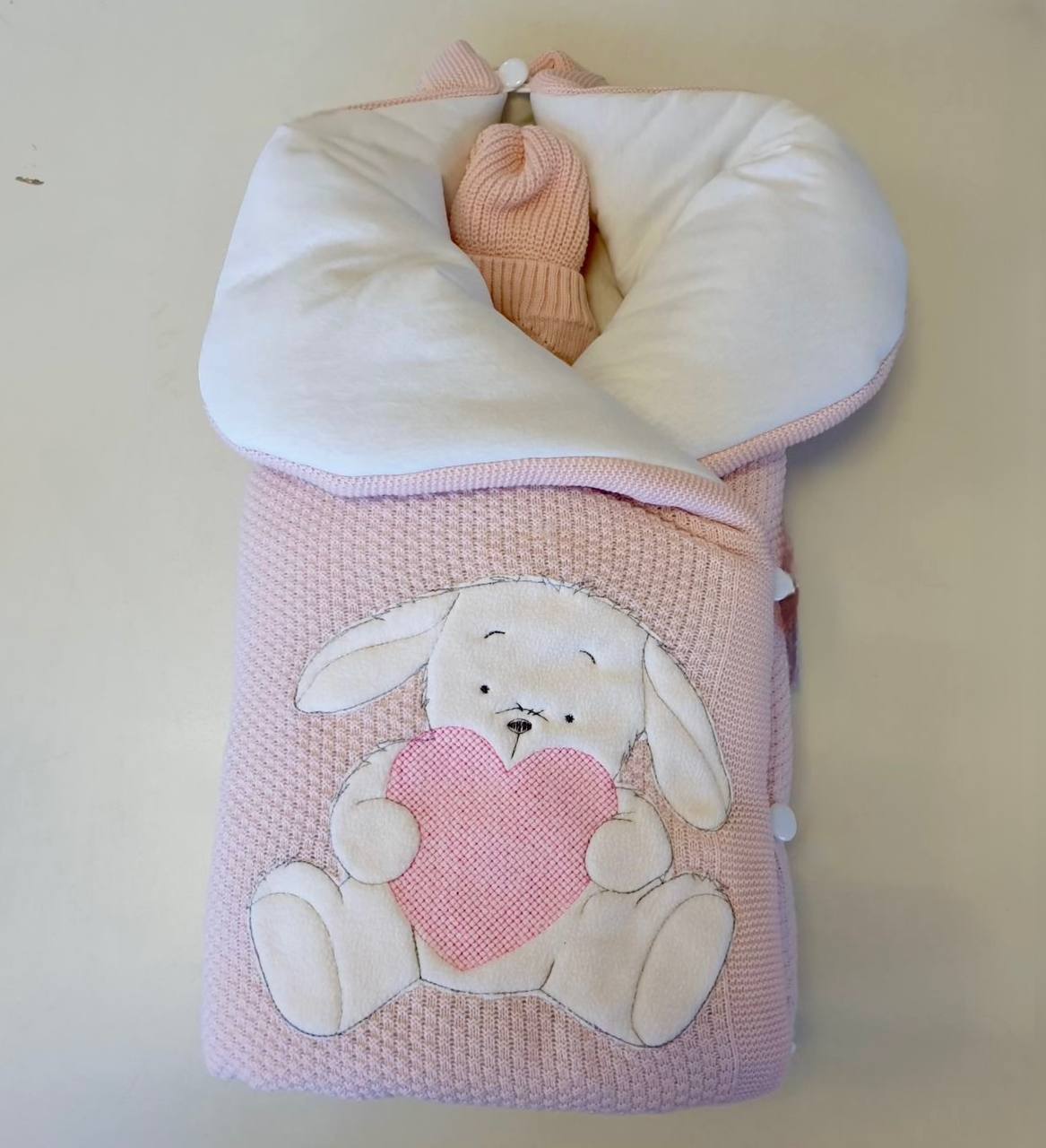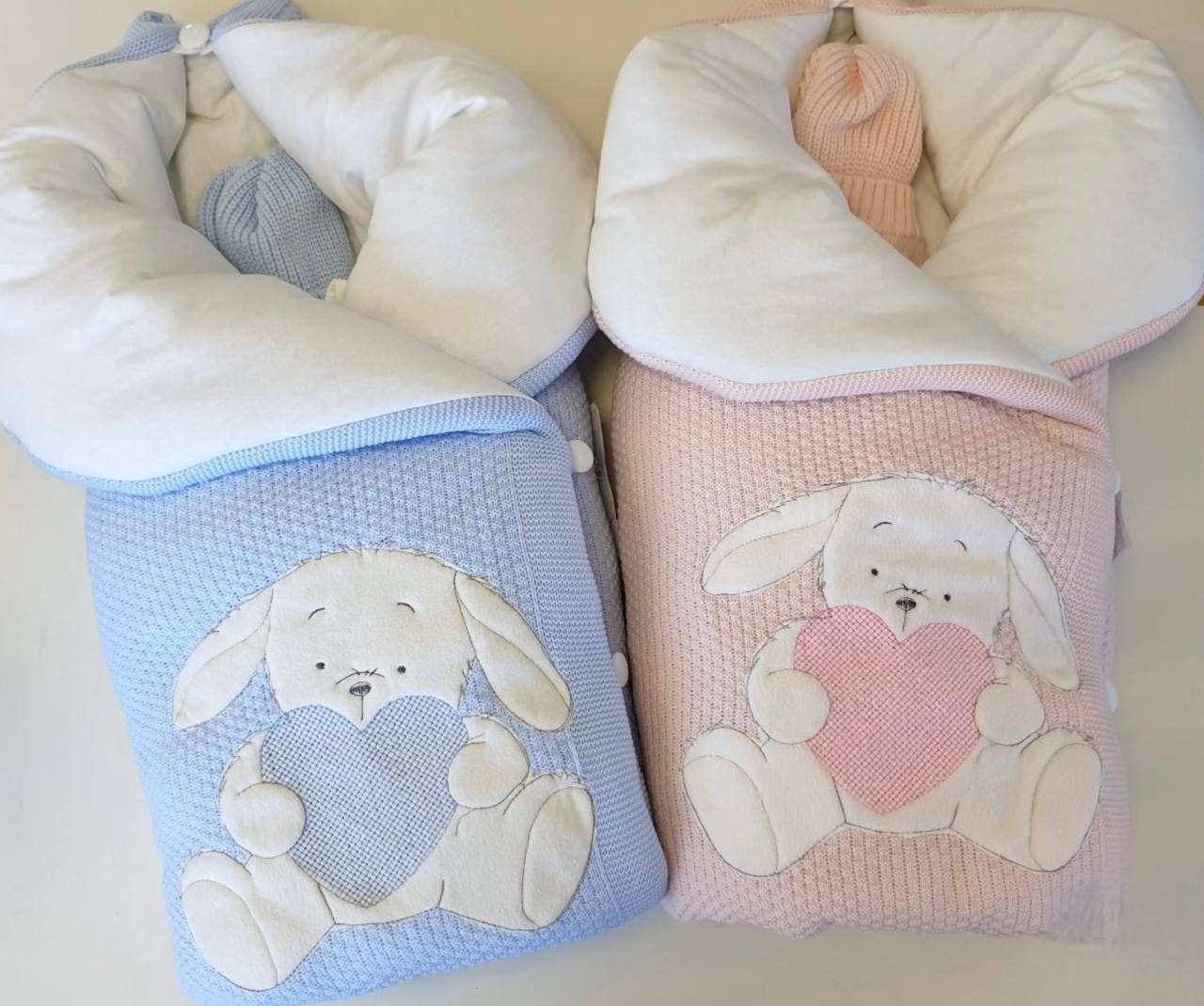 Одеяло-конверт на 4х пуговицах. На одеяле присутствует милая вышивка зайки. Размер одеяла в расправленном виде: 100х100 см (+-5 см) ( вязанное полотно, кулирный трикотаж, утеплитель по сезону)
