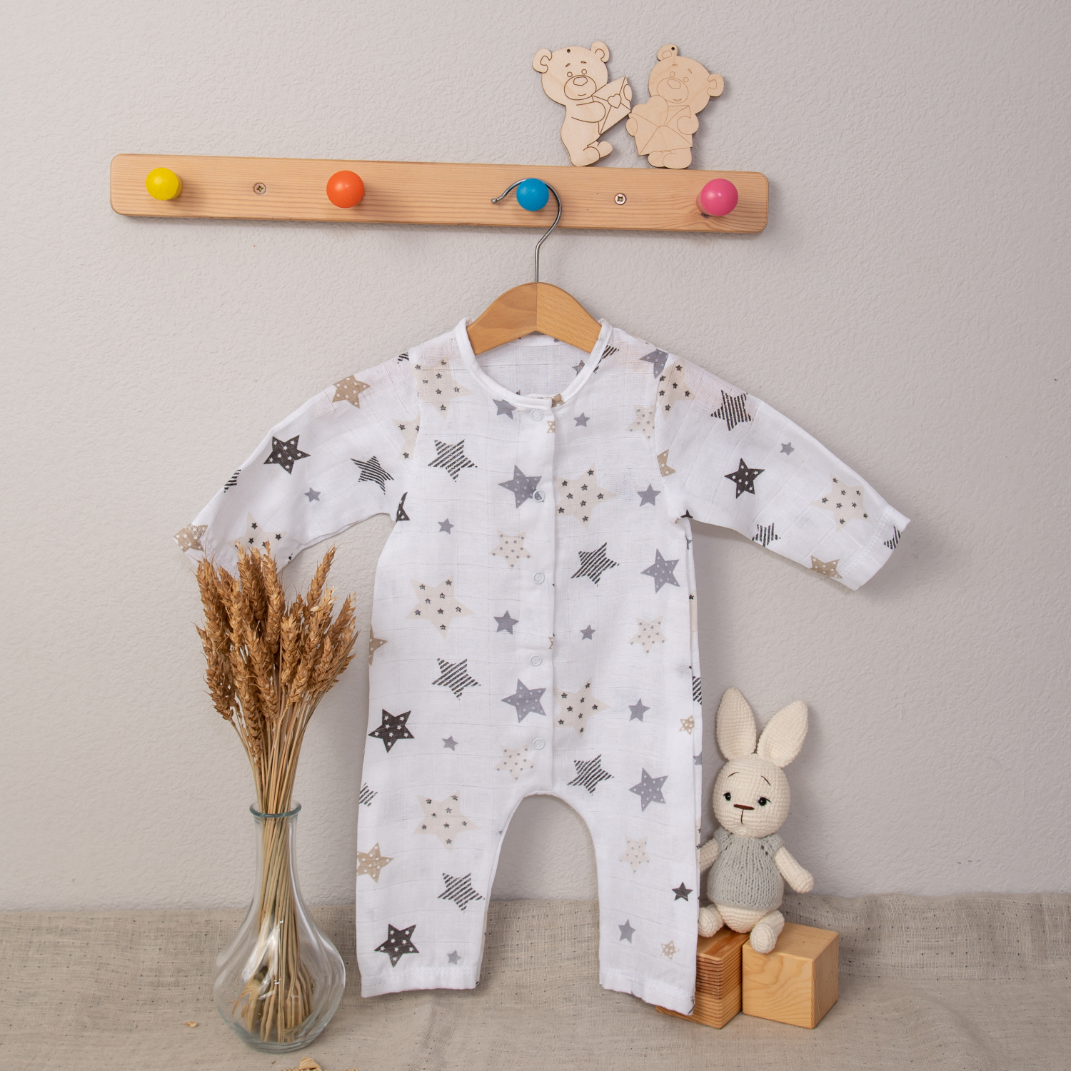 Супер-воздушный комбинезон-слип из муслина с набивным рисунком. Полотняное переплетение и облегченная тонкость муслина учитывают воздушный поток, уменьшая риск перегрева тела. Это качество помогает держать организм малыша в комфорте и безопасности, что приводит к спокойствию.