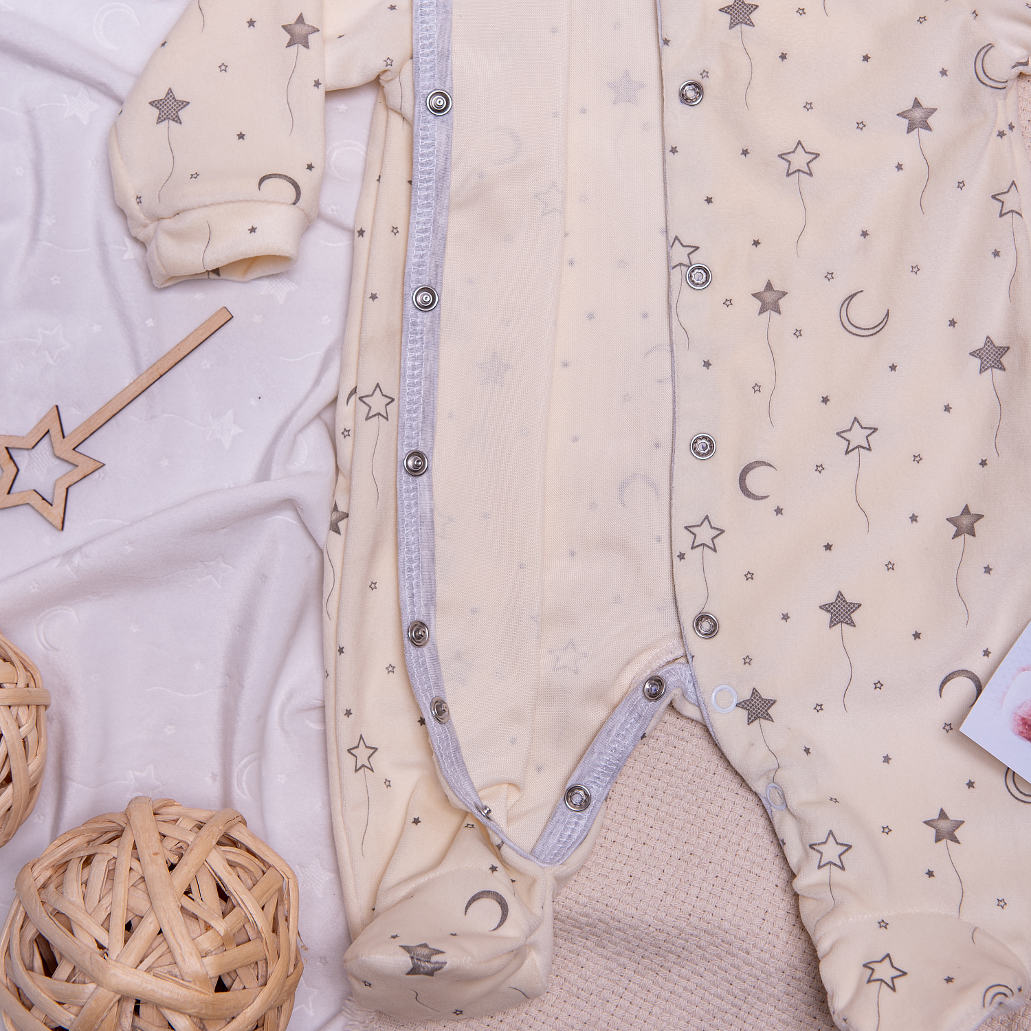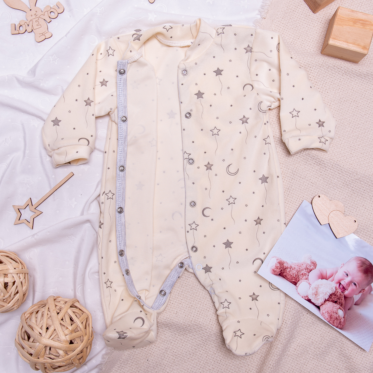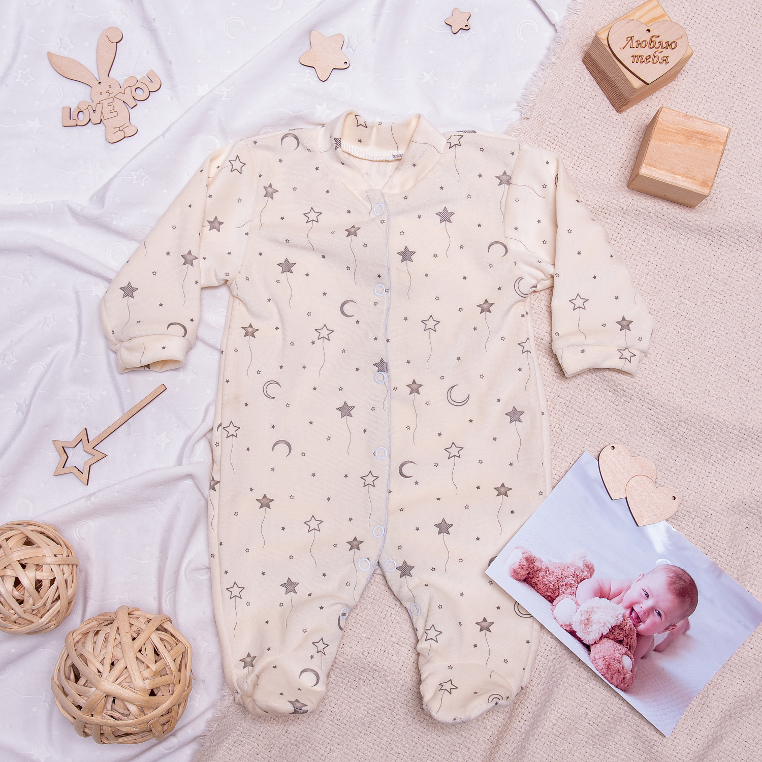 Комбинезон из молочного вельбоа с рельефным рисунком, модель на кнопках с закрытыми ножками.