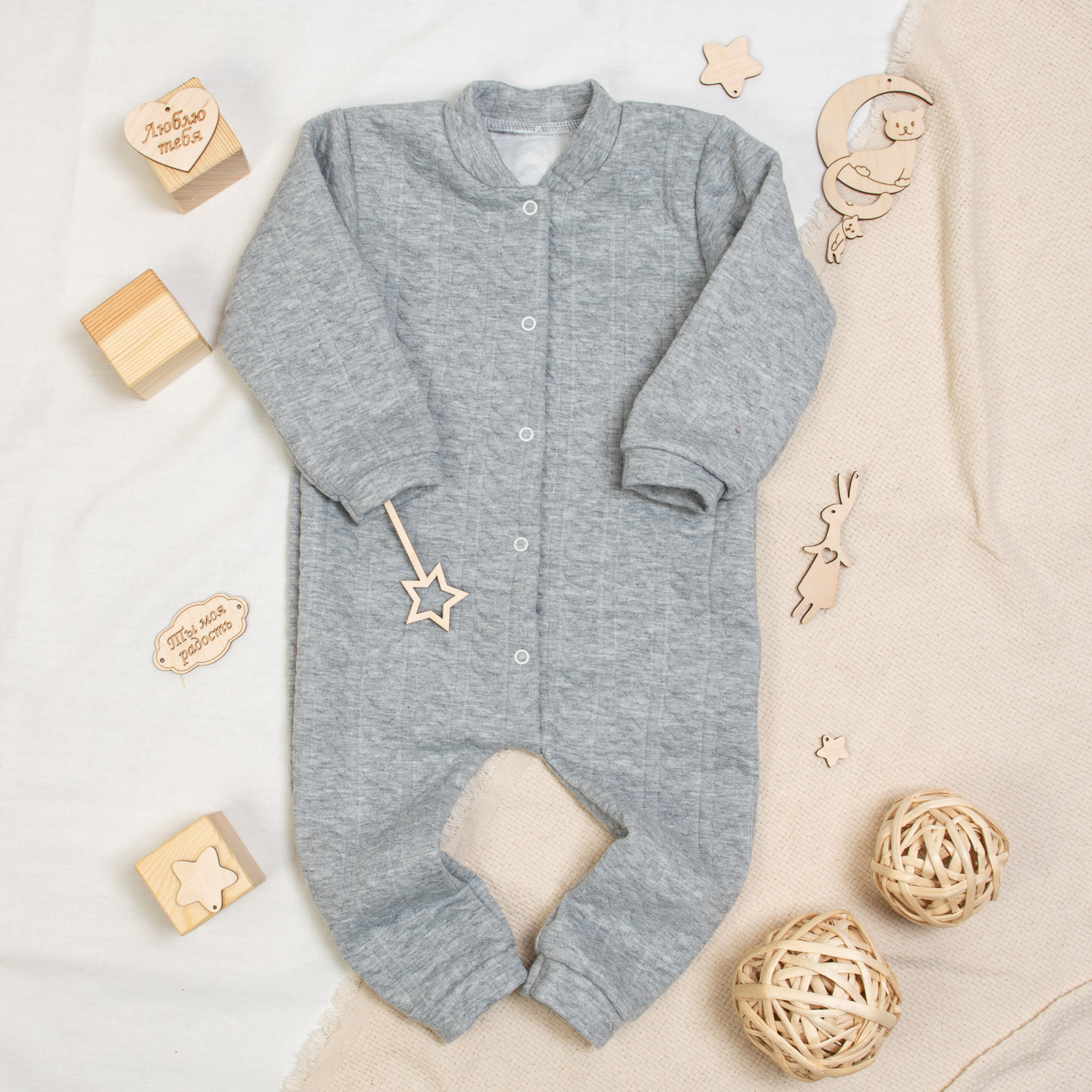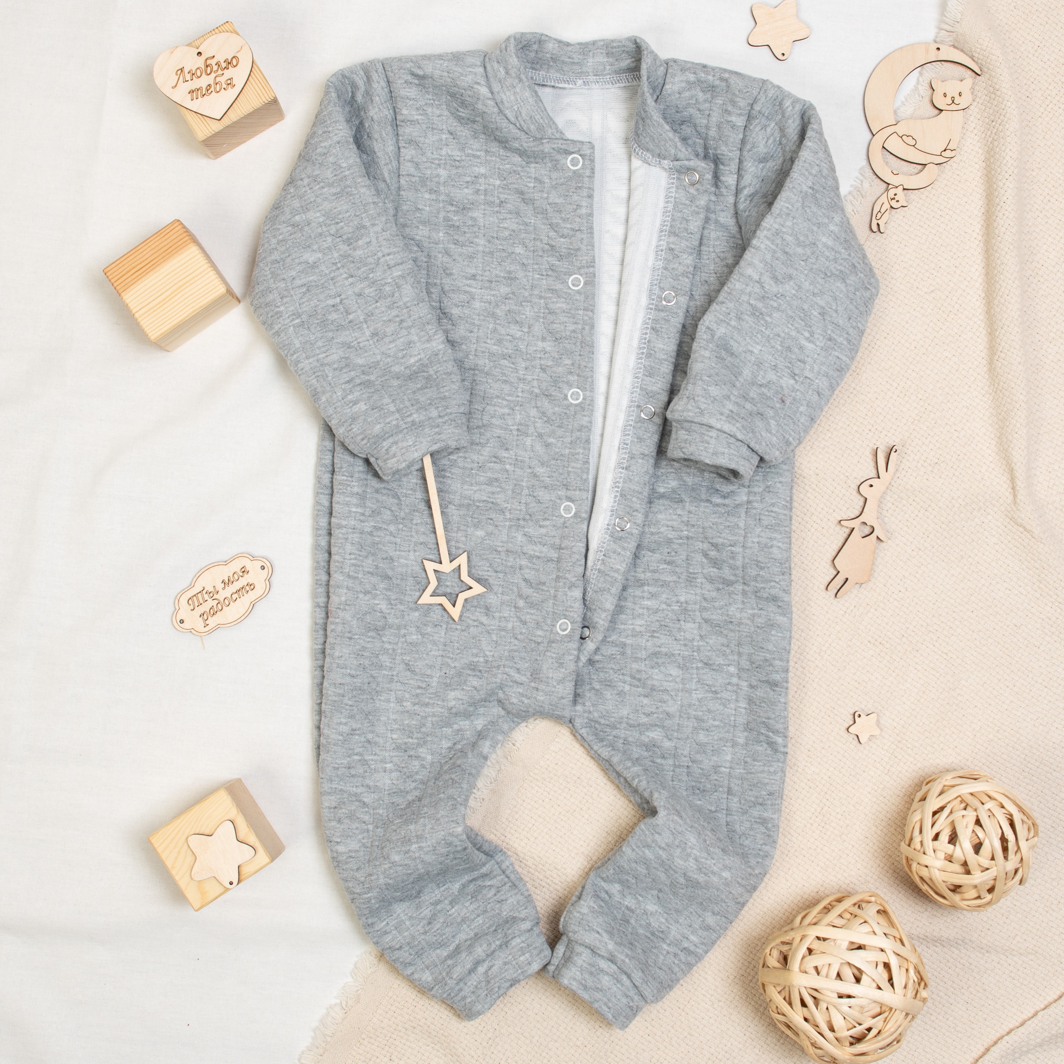 Удобный детский комбинезон из серого капитония на кнопках. Рукава и штанины на манжетах, Модель создана как для самостоятельного ношения, так и в качестве утеплителя или поддевы.